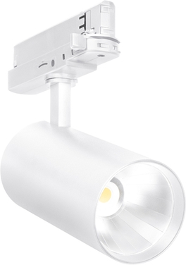 Produkteigenschaften: Kompakter Stromschienen-Strahler mit hocheffizientem Reflektor und in der Schiene integriertem Vorschaltgerät. Drehwinkel: 350°, Neigungswinkel: 90°. Verfügbar mit Farbtemperatur 3000 K oder 4000 K. Farbwiedergabeindex Ra 90. Anfängliche Farbkonsistenz: < 5 SDCM (Schwellwerteinheit). Ausgestattet mit Reflektor mit 24 ° Ausstrahlwinkel. Gehäuse aus langlebigem Alu-Druckguss. Verfügbar in Mattweiß (ähnlich RAL9003), Mattschwarz (ähnlich RAL9005). Leuchten-Lichtausbeute: bis zu 130 lm/W
